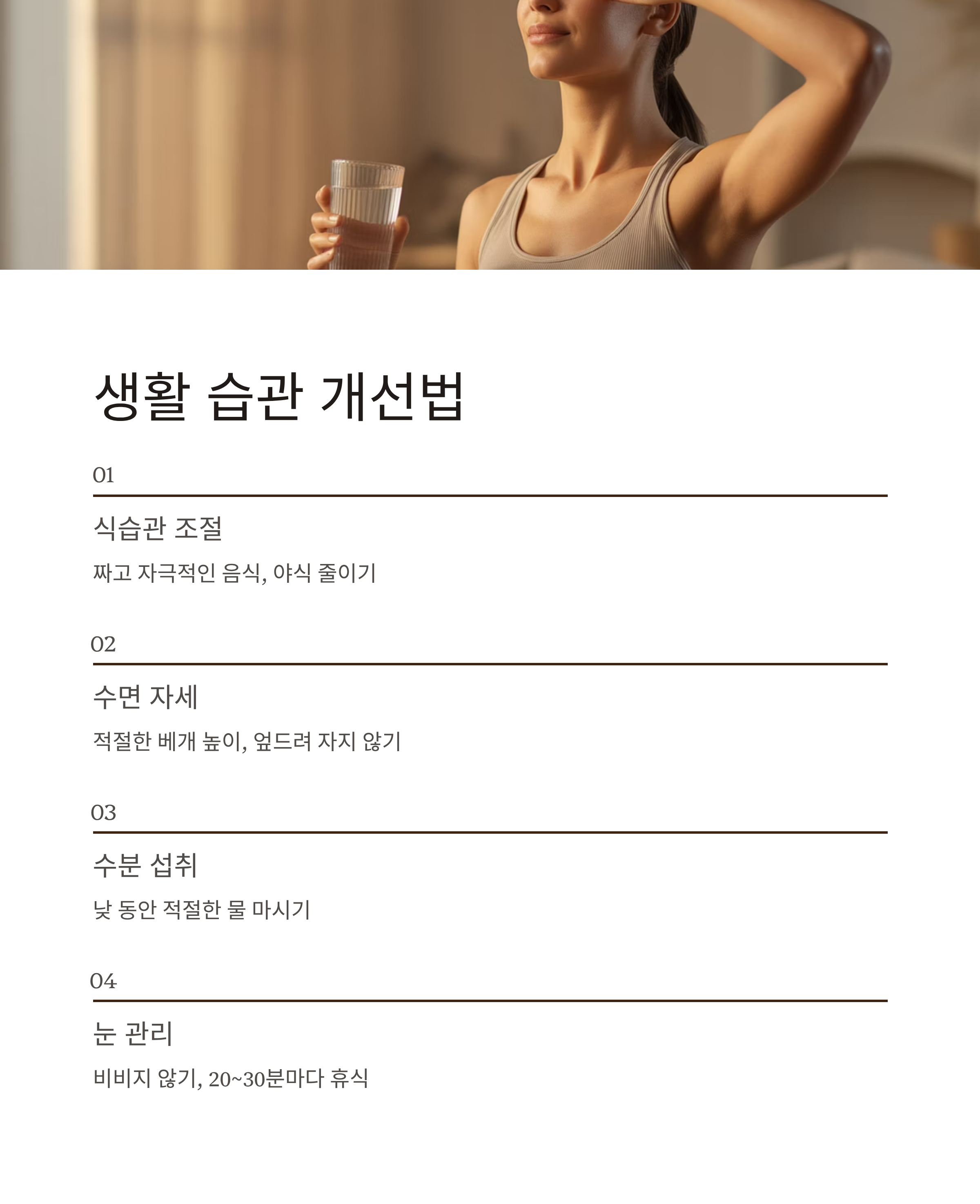 일상 속 사소한 습관만 바꿔도 눈꺼풀 부기를 줄이는 데 도움이 됩니다. 눈 건강을 위해 다음과 같은 생활 수칙을 실천해 보세요.