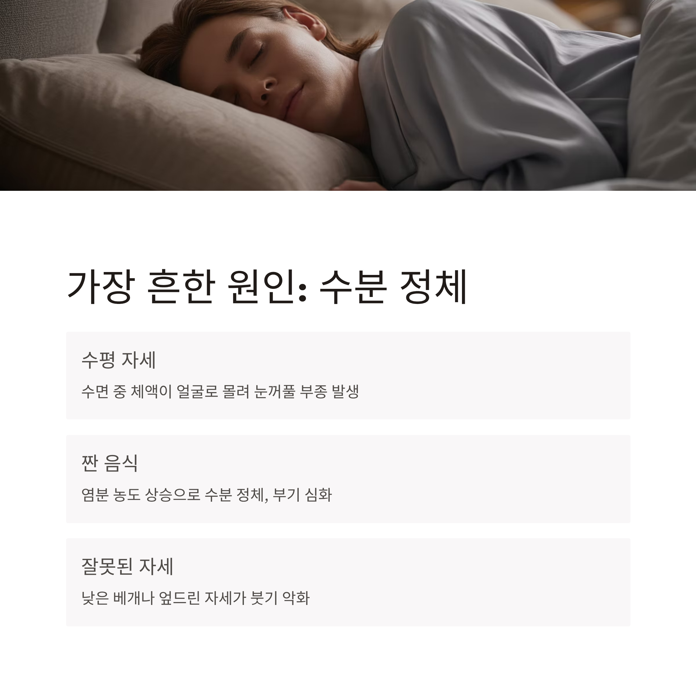가장 흔한 원인은 수분 정체와 혈액순환 저하입니다. 잠을 자는 동안 몸이 수평이 되면서 체액이 얼굴 쪽으로 몰리고, 특히 눈 주위 피부가 얇기 때문에 부종이 쉽게 드러납니다.