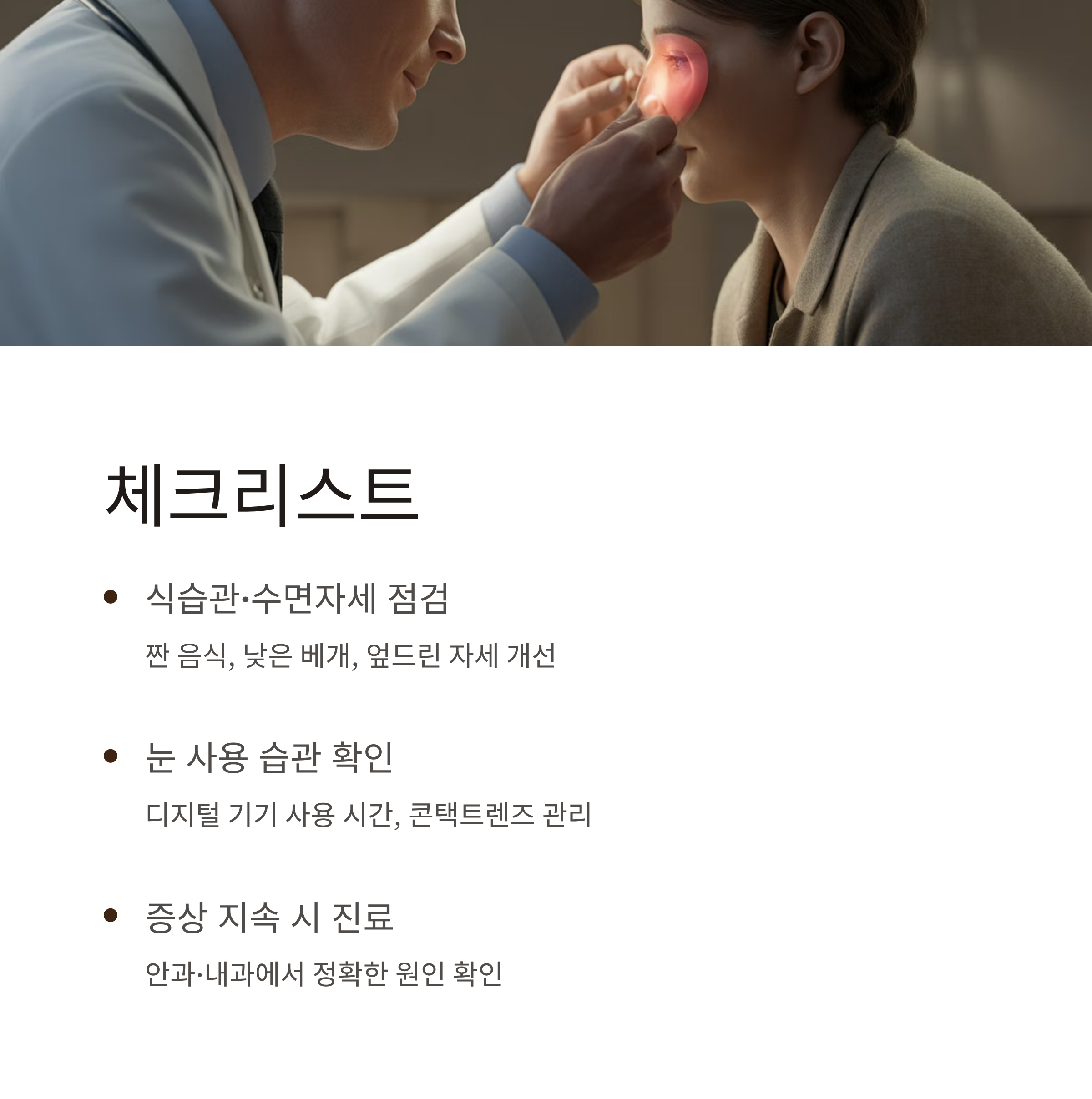 이런 경우에는 내과나 안과에서 혈액검사·소변검사 등 기본 검진을 통해 원인을 확인하는 것이 좋습니다.