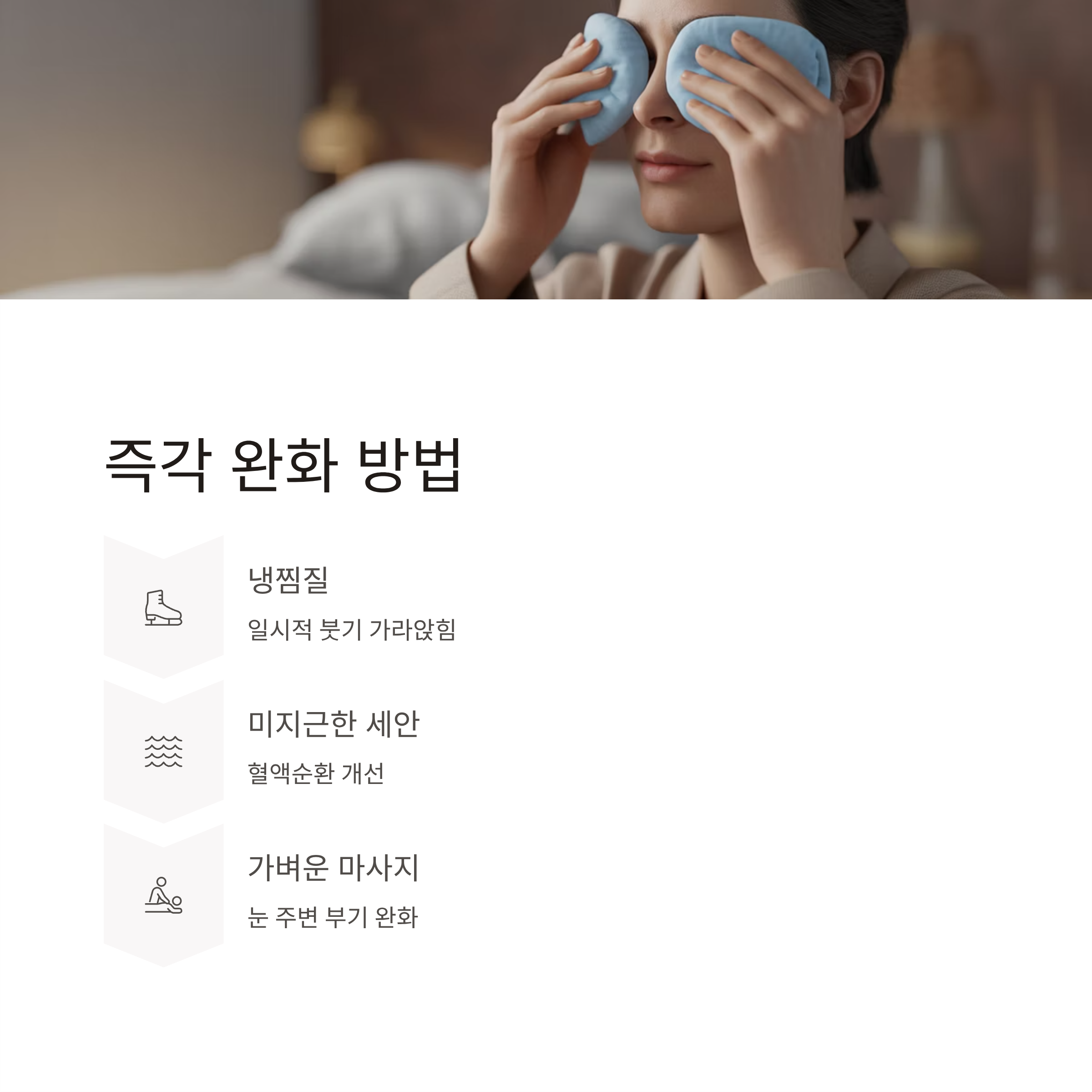 간단한 냉찜질이나 미지근한 물 세안, 가벼운 눈 주변 마사지도 일시적인 부기를 가라앉히는 데 도움을 줄 수 있습니다.