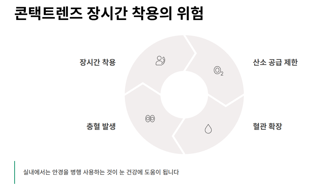 콘택트렌즈를 오랜 시간 착용하면 각막으로의 산소 공급이 제한될 수 있습니다. 산소가 부족해지면 눈은 이를 보완하기 위해 혈관을 확장시키고, 그 결과 충혈이 쉽게 나타날 수 있습니다.