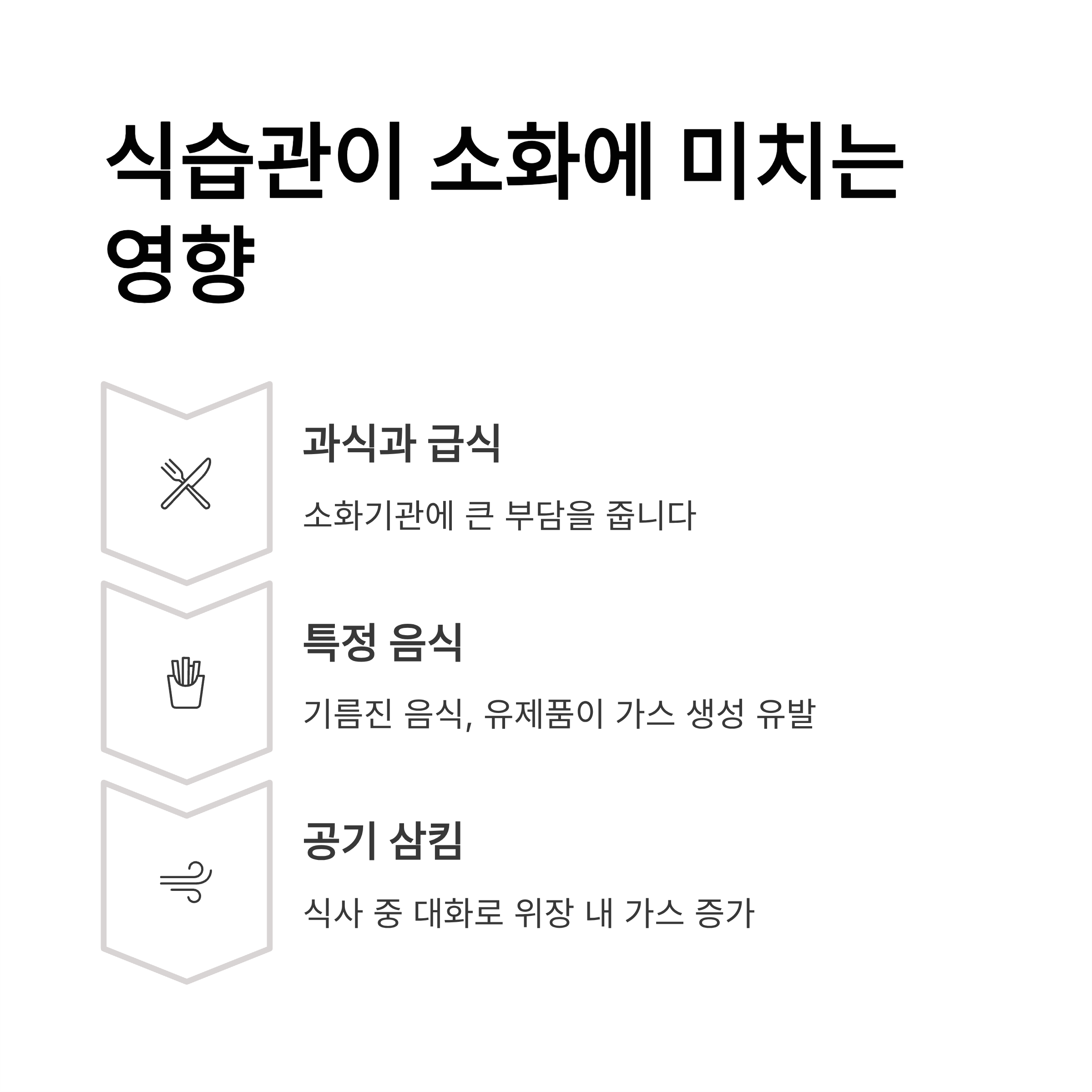 과식하거나 급하게 먹는 습관은 소화기관에 큰 부담을 줍니다. 또한 기름진 음식, 탄산음료, 유제품 등 특정 음식은 개인에 따라 가스 생성이나 소화 불량을 유발하기 쉽습니다.