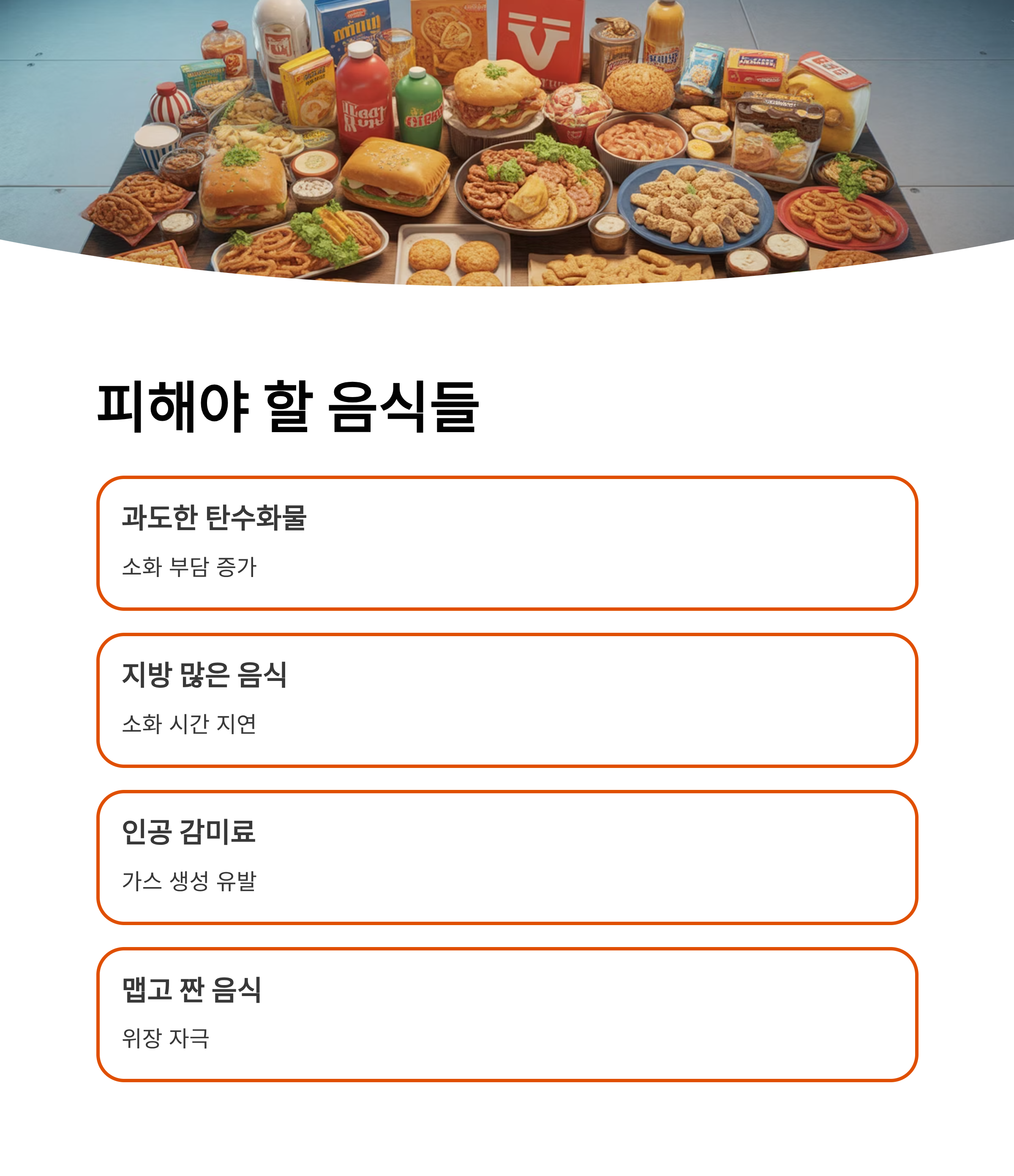 과도한 탄수화물, 지방, 인공 감미료, 유제품, 맵고 짠 음식 등은 소화에 부담을 주거나 가스를 유발하기 쉬우므로 섭취를 조절해야 합니다.