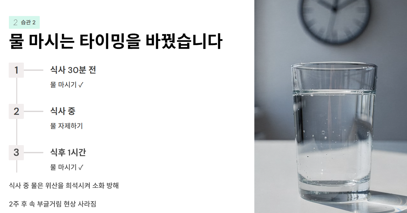 저는 물을 많이 마시는 게 좋다고 해서 식사 중에도, 식사 직후에도 벌컥벌컥 마셨습니다. 하지만 이는 위산을 희석시켜 오히려 소화를 방해하는 행동이었습니다. 식사 중 마시는 물은 소화 효소의 작용을 방해하여 소화를 더디게 할 수 있습니다. 그래서 식사 30분 전과 식후 1시간 뒤에 물을 마시는 것으로 규칙을 바꿨습니다. 처음에는 식사 중 목이 메는 것 같아 힘들었지만, 음식을 더 오래 씹으니 침이 충분히 분비되어 괜찮아졌습니다. 2주가 지나자 속이 부글거리던 현상이 눈에 띄게 사라졌습니다.