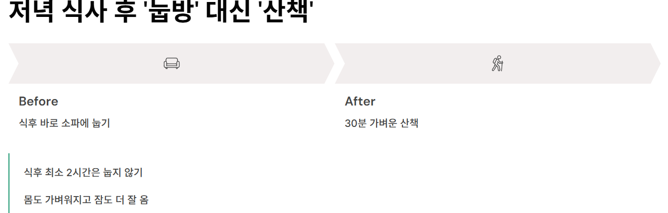 하루 일과를 마치고 저녁을 먹은 뒤 소파에 눕는 것이 유일한 낙이었습니다. 하지만 식사 후 바로 눕는 습관은 위산 역류를 유발하고 소화를 방해하는 최악의 습관 중 하나였습니다. 식후에 바로 누우면 음식물이 위에 머무르는 시간이 길어져 각종 소화기 증상을 유발할 수 있습니다. 식사 후 최소 2시간은 눕지 않는 것이 좋으며, 저는 이 시간을 활용해 서서 설거지를 하거나 가벼운 스트레칭을 했습니다. 특히 저녁 식사 후 30분 정도의 가벼운 산책을 습관으로 만드니 몸도 가벼워지고, 잠도 더 잘 오기 시작했습니다.