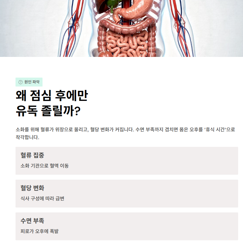 식사 후 졸음은 누구나 어느 정도 겪을 수 있습니다. 문제는 그 강도가 “업무가 불가능할 정도”로 세지고, 거의 매일 같은 시간에 반복된다는 점입니다. 점심 식사 뒤에는 소화를 위해 혈류가 위장 쪽으로 더 몰리고, 식사 구성에 따라 혈당 변화도 커집니다. 여기에 전날 잠이 부족했다면, 몸은 점심 이후를 ‘잠깐 쉬어도 되는 시간’으로 오해하고 졸음을 강하게 보내기도 합니다.