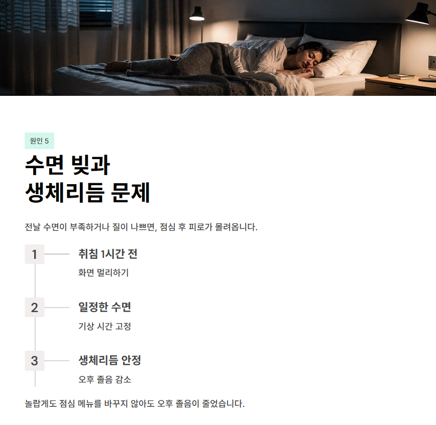 저는 잠들기 1시간 전 화면을 멀리하고, 기상 시간을 일정하게 유지하는 것부터 시작했습니다. 놀랍게도 점심 메뉴를 크게 바꾸지 않은 날에도, 오후 졸음 강도가 줄었습니다.