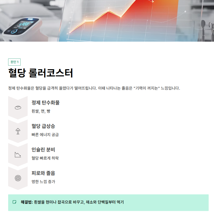 제가 가장 먼저 체감했던 원인은 혈당 변화였습니다. 면 요리, 흰쌀밥, 빵처럼 정제 탄수화물 위주의 식사는 식후 혈당을 빠르게 올릴 수 있습니다. 이후 몸이 혈당을 낮추려고 인슐린을 많이 분비하면, 혈당이 다시 빠르게 떨어지면서 피로감과 멍한 느낌이 커질 수 있습니다. 이때 나타나는 졸음은 “잠이 온다”기보다 “기력이 꺼진다”는 느낌에 가깝습니다.
