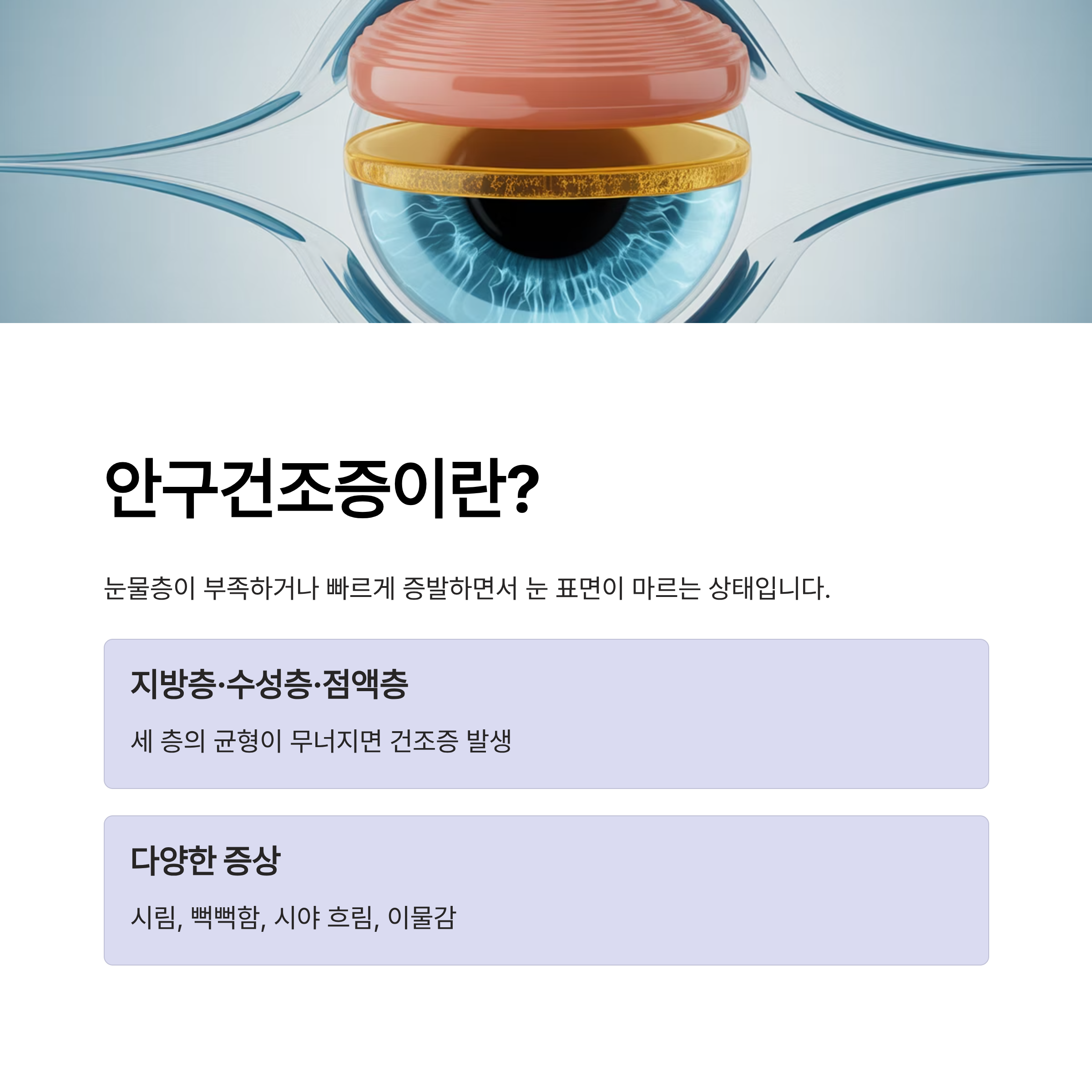 안구건조증은 눈을 보호하는 눈물층이 부족하거나 빠르게 증발하면서 눈 표면이 마르는 상태를 말합니다. 눈물은 지방층·수성층·점액층이 균형을 이루면서 눈을 촉촉하게 보호하는데, 이 균형이 무너지면 눈이 시리고 뻑뻑해지는 증상이 나타납니다.