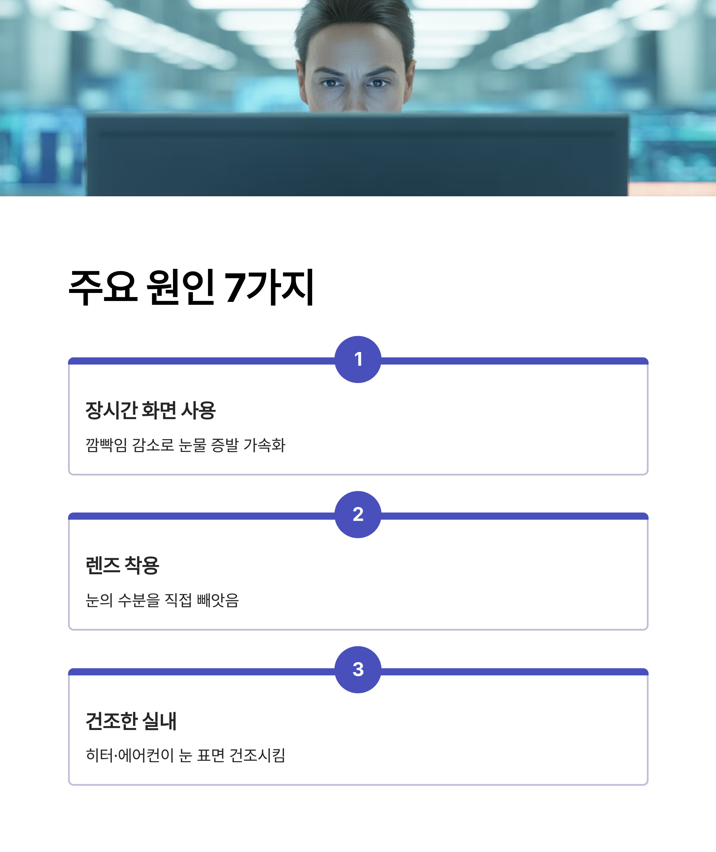 컴퓨터·스마트폰을 볼 때 깜빡임이 평소보다 크게 줄어 눈물이 쉽게 증발합니다.