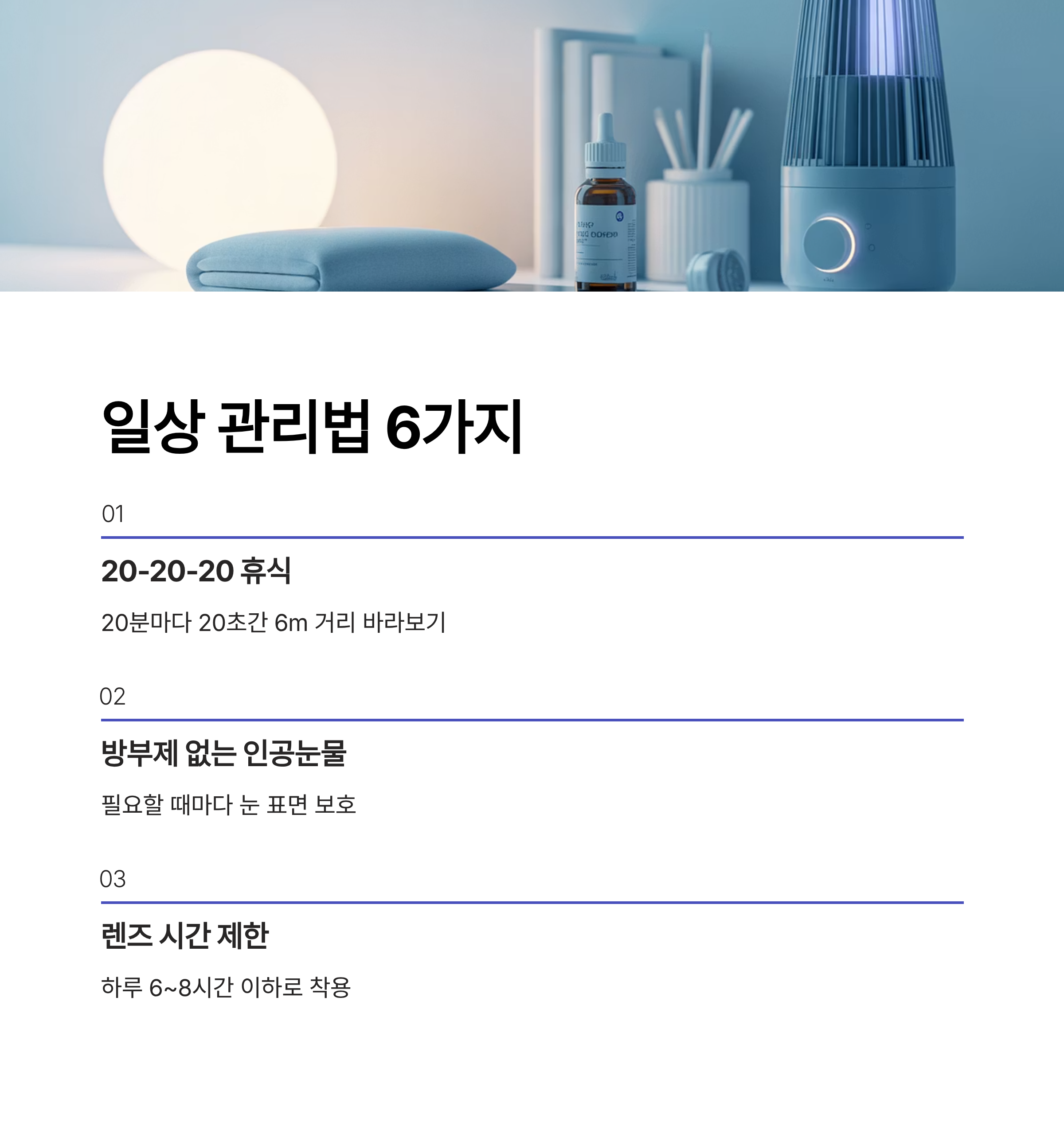 안구건조증은 생활습관과 환경 관리만으로도 충분히 개선되는 경우가 많습니다.