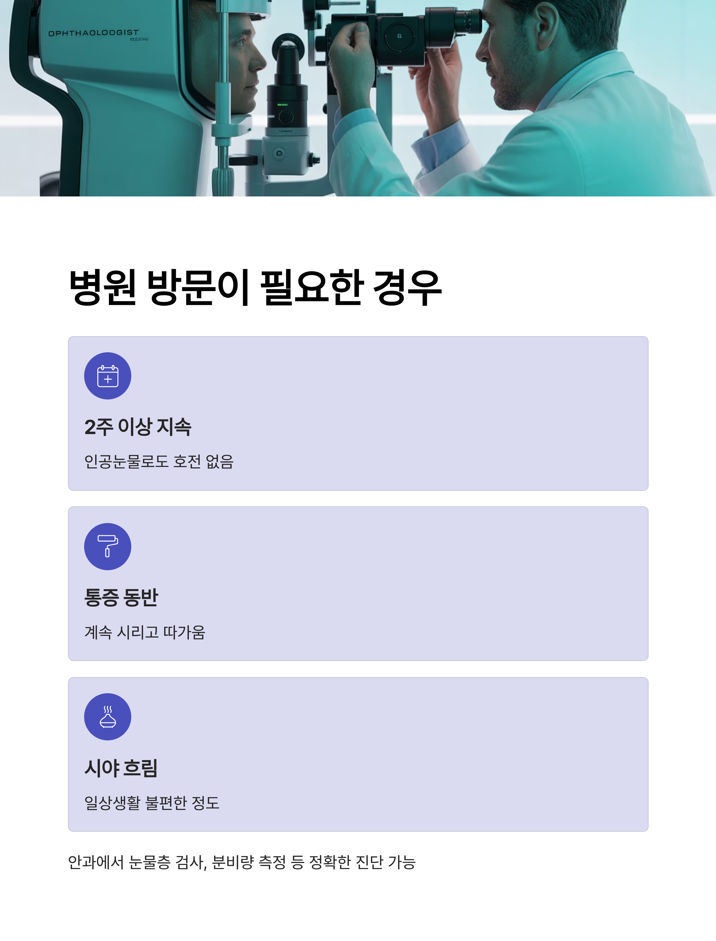 - 인공눈물을 사용해도 2주 이상 호전이 없을 때