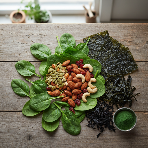 - 대표 음식: 아몬드, 호박씨 등 견과류, 시금치, 해조류