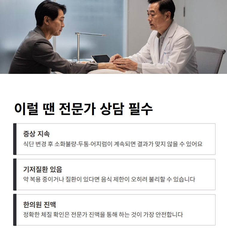 이럴 땐 억지로 식단을 고집하기보다 한의원에서 진맥을 통해 체질을 확인하는 것이 안전합니다. 특히 기존 질환이 있거나 약을 복용 중인 경우에는 특정 음식 제한이 오히려 건강에 불리할 수 있으니 더더욱 ‘확인 후 조절’이 좋아요.