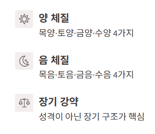 흔히 양 체질은 활동적이고 외향적인 경향, 음 체질은 차분하고 내향적인 경향을 이야기하지만, 이건 어디까지나 일반적인 이미지에 가깝습니다. 8 체질의 핵심은 성격 분류가 아니라 장기의 강약 구조에서 출발한다는 점이에요. 그래서 같은 음식이라도 어떤 체질에게는 도움이 되지만, 다른 체질에게는 부담이 될 수 있다고 봅니다.